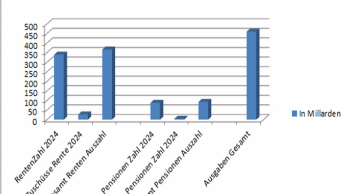 zuzüglich 5 Milliarden Euro für die knappschaftliche Rentenversicherung. Für die Beamtenversorgung liegen die genauen Ausgaben für 2024 noch nicht vor, jedoch wurden für 2023 im unmittelbaren Bundesbereich 6,8 Milliarden Euro für Pensionen von Beamten, Richtern und Berufssoldaten ausgegeben, was etwa 1,5% des damaligen Bundeshaushalts entsprach.