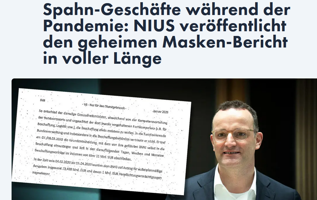 Der Bericht über Masken-Geschäfte des damaligen Bundesgesundheitsministers und heutigen Vorsitzenden der Unionsfraktion Jens Spahn (CDU) in der Corona-Zeit. Spahn hatte während der Pandemie Masken zu völlig überteuerten Preisen eingekauft, die den Steuerzahler Milliarden Euro kosteten.
