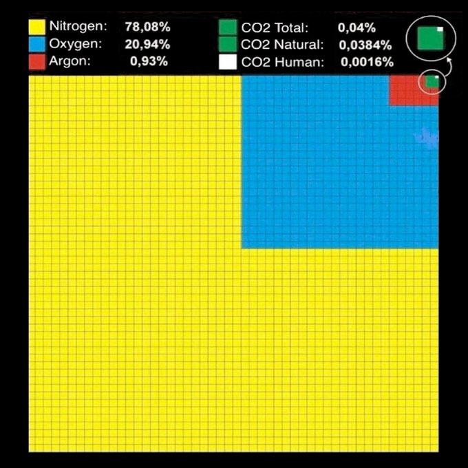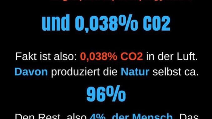 Dann haben wir das ganz fürchterliche CO2. Jeder glaubt inzwischen zu wissen, dass CO2 ein großer Klimakiller ist. Dabei ist es zunächst mal, rein chemisch-physikalisch, ein unsichtbares, geruchloses und – bis zu bestimmten Prozentsätzen – ungiftiges Gas, das unverzichtbar für alle Pflanzen der Erde ist.