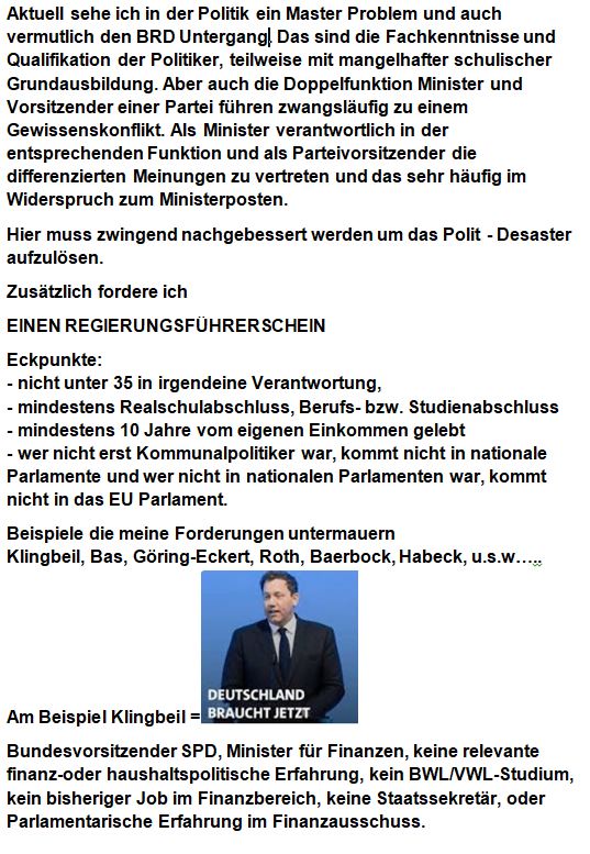 Aktuell sehe ich in der Politik ein Master Problem und auch vermutlich den BRD Untergang. Das sind die Fachkenntnisse und Qualifikation der Politiker, teilweise mit mangelhafter schulischer Grundausbildung. Aber auch die Doppelfunktion Minister und Vorsitzender einer Partei führen zwangsläufig zu einem Gewissenskonflikt. Als Minister verantwortlich in der entsprechenden Funktion und als Parteivorsitzender die differenzierten Meinungen zu vertreten und das sehr häufig im Widerspruch zum Ministerposten.