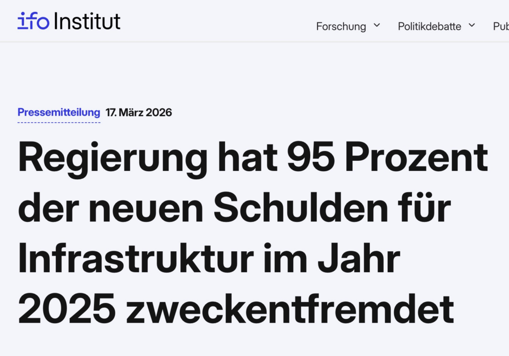 Nun aber sieht die Realität so aus, dass praktisch keine “Zukunftsinvestitionen” und auch keine “Infrastrukturmaßnahmen” stattfanden, ja noch nicht einmal für den ebenfalls zum Verwendungszweck erklärten Klima-Schwachsinn die versprochenen Gelder flossen – sondern die Gelder, genau wie von Beginn an befürchtet wurde, für laufende Kosten und zum Stopfen von Haushaltslöchern in einem total aufgeblähten Umverteilungs- und Versorgungsstaat verfrühstückt wurden. Laut IW wurden bislang 86 Prozent, dem ifo-Institut zufolge sogar 95 Prozent der Mittel zweckentfremdet. Der Ifo-Analyse zufolge ist die Schuldenaufnahme 2025 im Rahmen des „Sondervermögens“ um 24,3 Milliarden Euro erhöht worden, die tatsächlichen Investitionen des Bundes liegen jedoch nur um 1,3 Milliarden Euro über denen von 2024. Die Lücke von 23 Milliarden Euro an neuen Schulden floss nicht in zusätzliche Investitionen – sondern stattdessen kam es „zu Verschiebungen einzelner Posten vom Kernhaushalt in das kreditfinanzierte Sondervermögen“, etwa in den Verkehrsbereich, so die ifo-Expertin Emilie Höslinger.