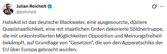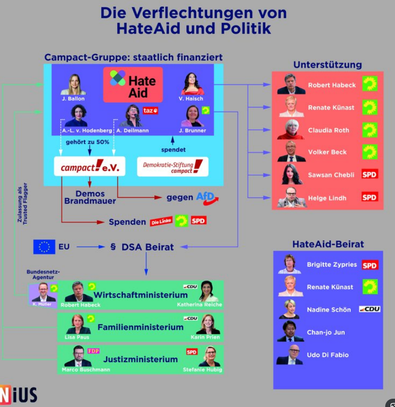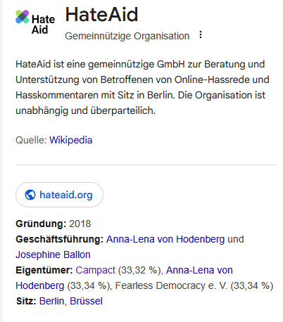 „HateAid ist eine gemeinnützige GmbH, die allein bis 2024 gut 4,7 Millionen Euro Steuergeld erhielt. Offiziell kämpft sie gegen ‚Hass im Netz‘. Tatsächlich aber hilft sie vor allem linken Politikern dabei, gegen Äußerungen von Bürgern vorzugehen und Präzedenzfälle zu schaffen. So unterstützte sie etwa Wirtschaftsminister Robert Habeck, der über 800 Anzeigen wegen Äußerungsdelikten erstattete, etwa gegen Bürger, die ihn als ‚Schwachkopf‘ bezeichneten oder gegen Journalisten, die ihn mit einem ‚Bahnhofsalkoholiker‘ verglichen.“